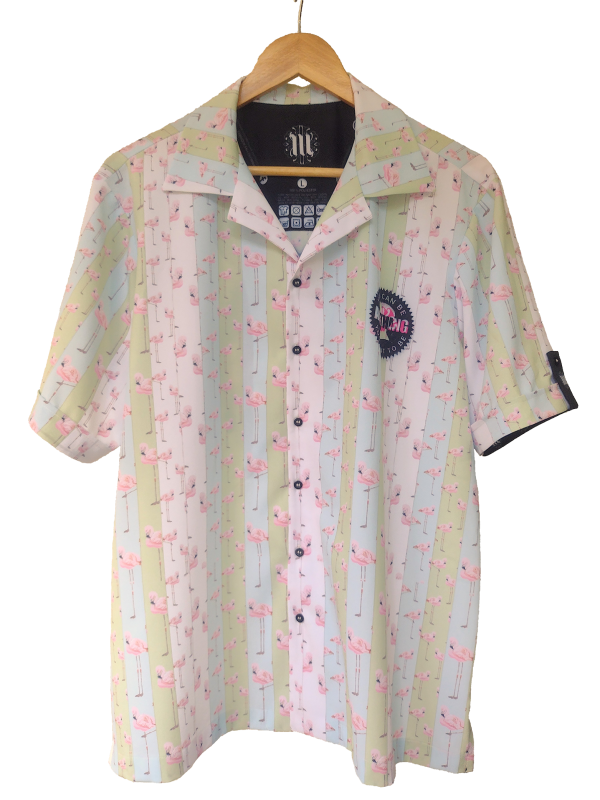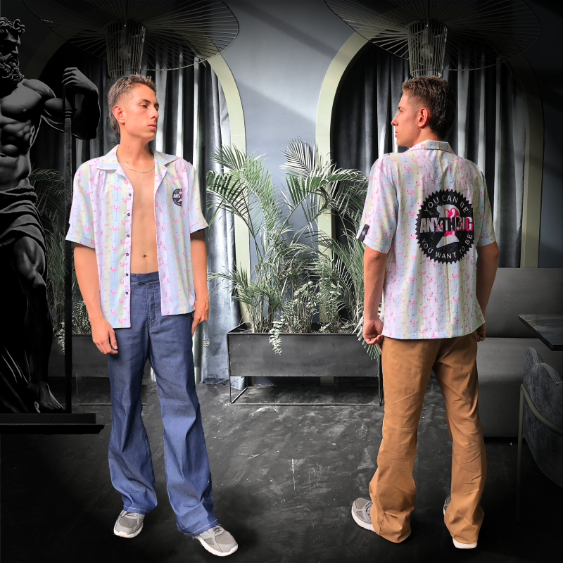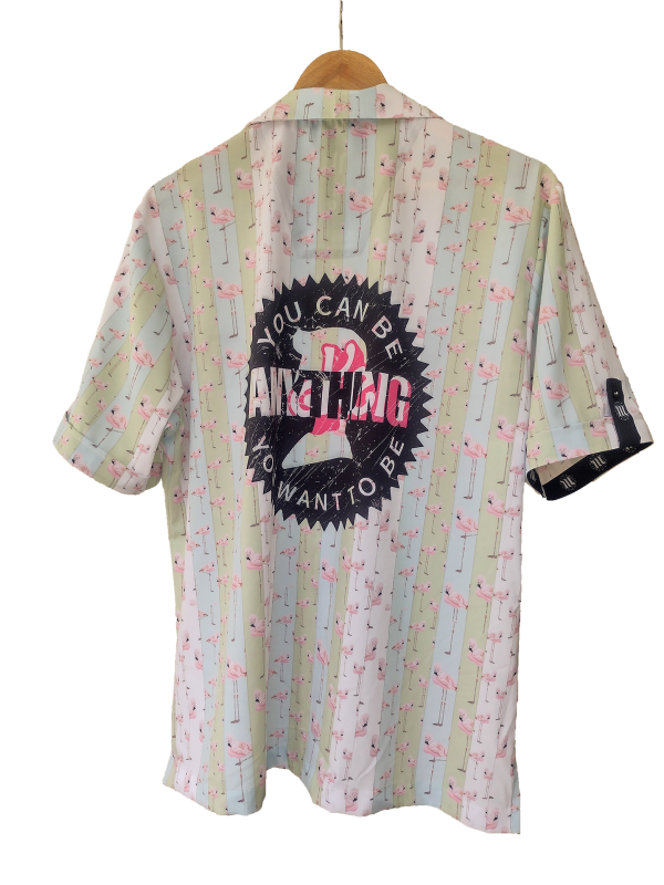 Men’s Resort Shirt with a flamingo theme in pastel shades and a print design inspired by the Barbie brand Slogan, but taking up Freddie Mercury’s famous quote «You can be anything (anyKen for us) you want to be»; to turn it into a Rocker Shirt!